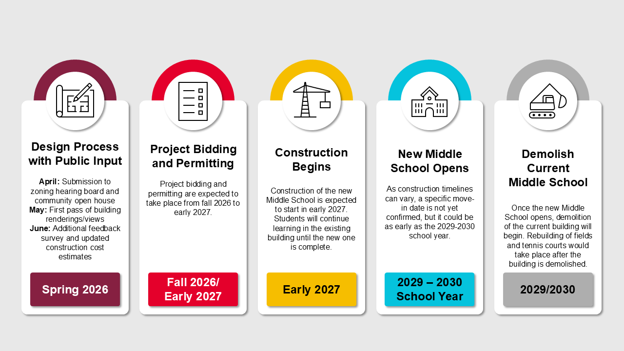 The Abington Middle School project is currently in the design phase. Construction of the new Middle School is estimated to start in 2027. Once the new Middle School is built, other construction projects on the Middle School campus will take place, such as restoring athletic facilities, constructing new parking, and demolishing the existing Middle School. The entire project will likely continue into the summer of 2030.